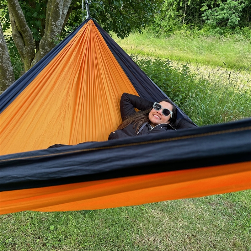 BaseCamp travel hammock from Tropical Hammocks. Note the large lying area in this double hammock 285 x 200 cm plus a pair of straps of 2 x 10 cm. Ingeniously made travel hammock without carrying cords. A safe hammock that is also good for children's play because the hammock is designed without the classic carrying cords. A distance of 180 cm is needed. Max load is 200 kg. 500 grams.