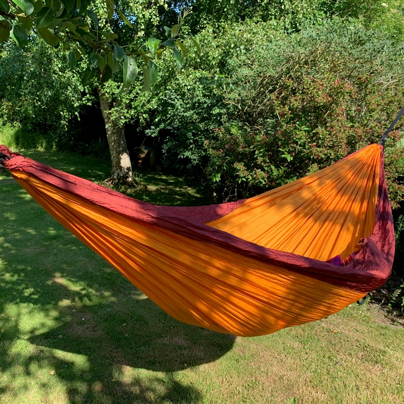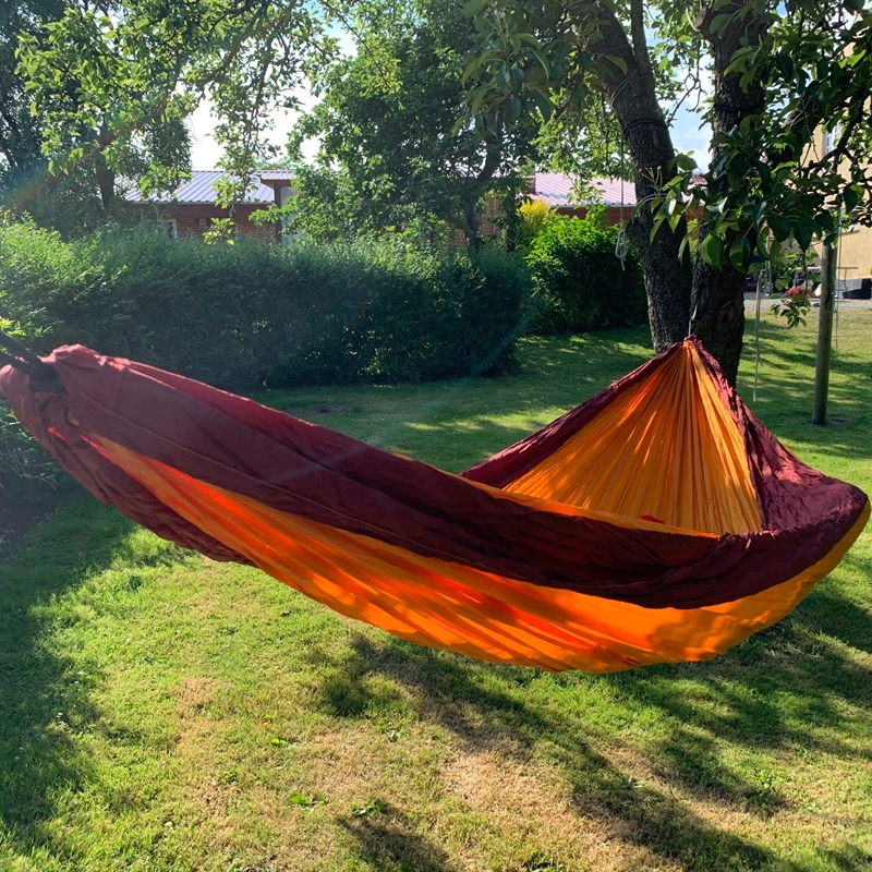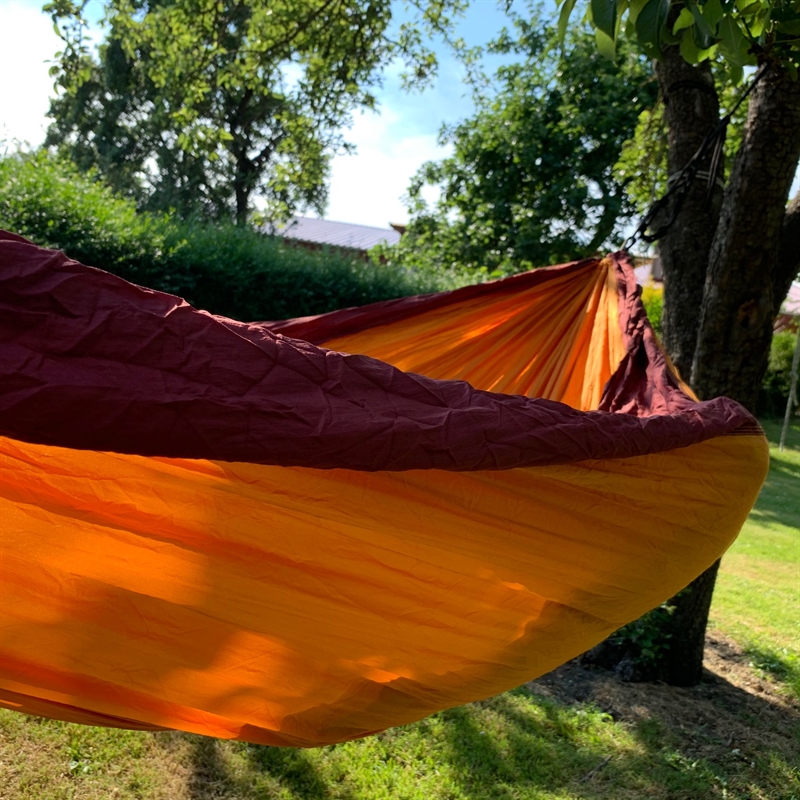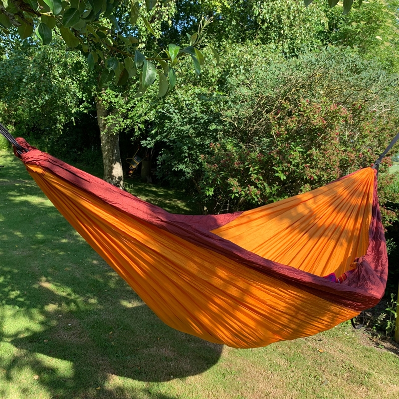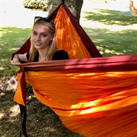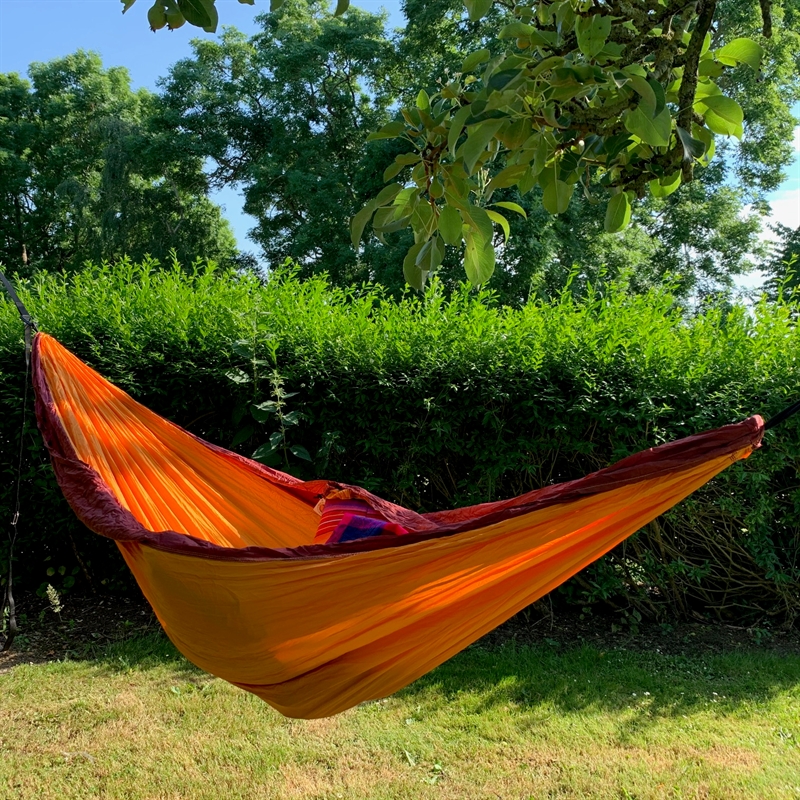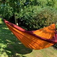 Double hammock 285 x 200 cm. burgundy and orange hammock. The material is 100% nylon (parachute silk). Ultra light parachute silk. Hammock weighs 500 grams.