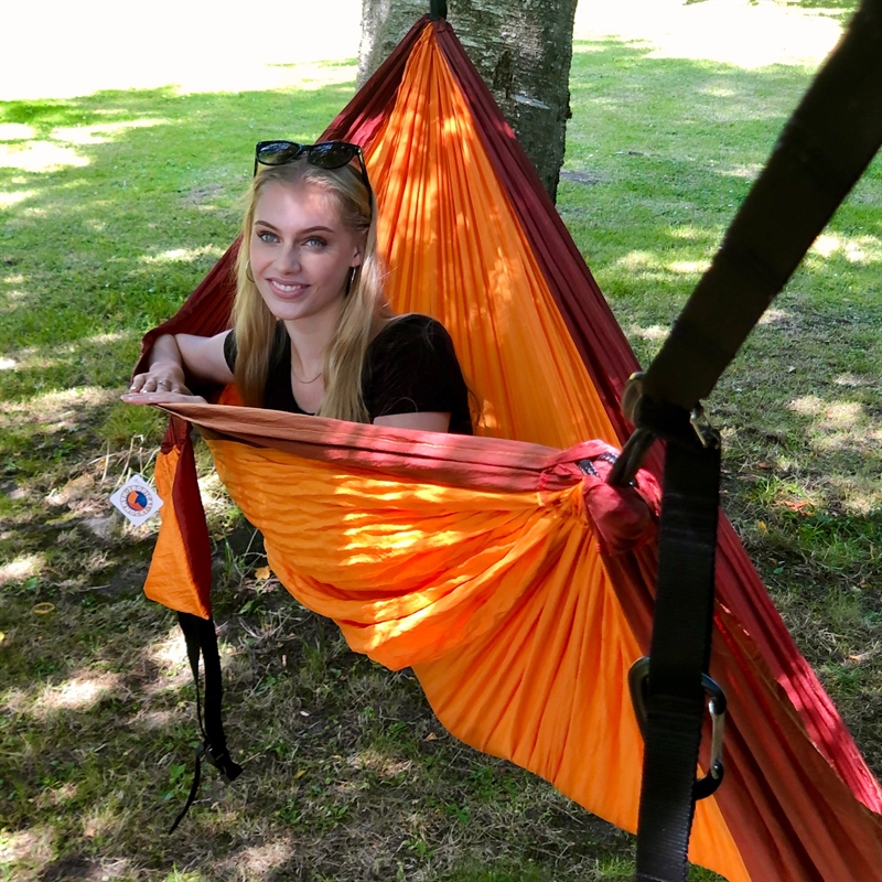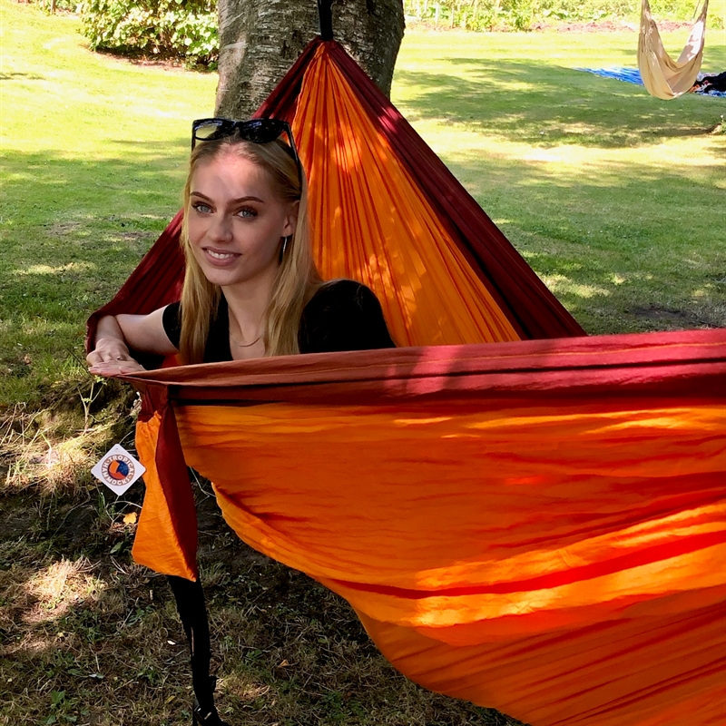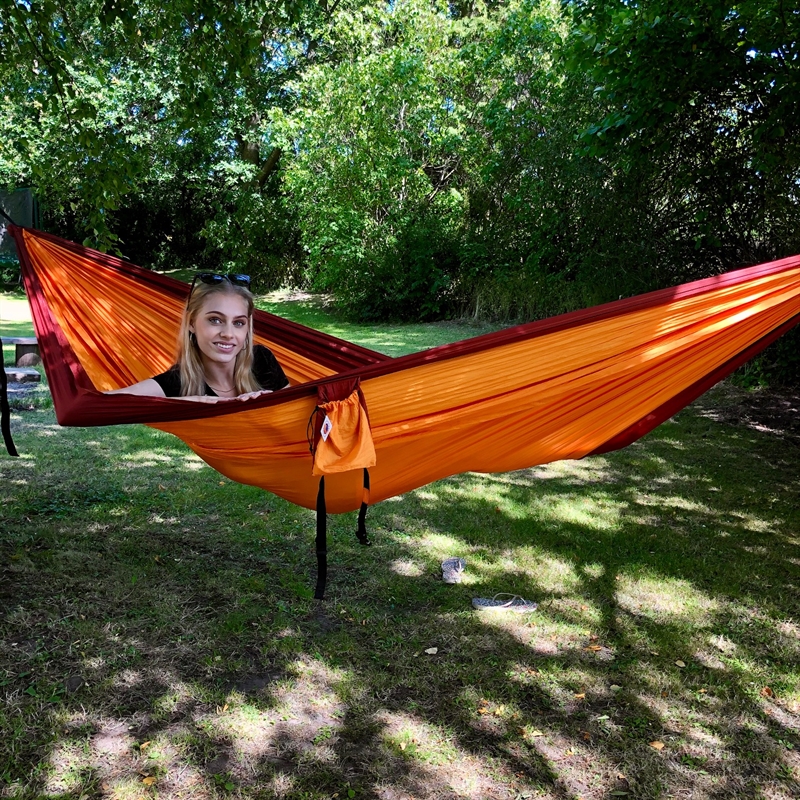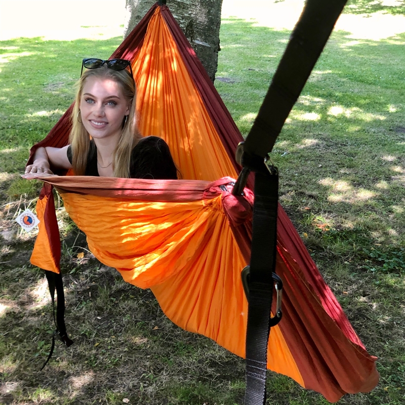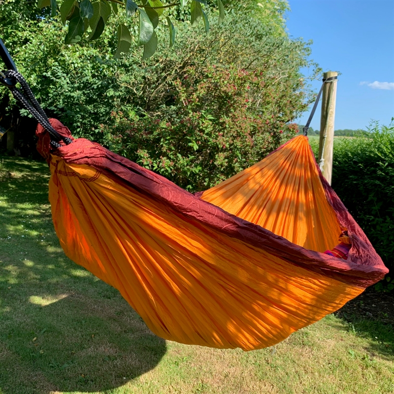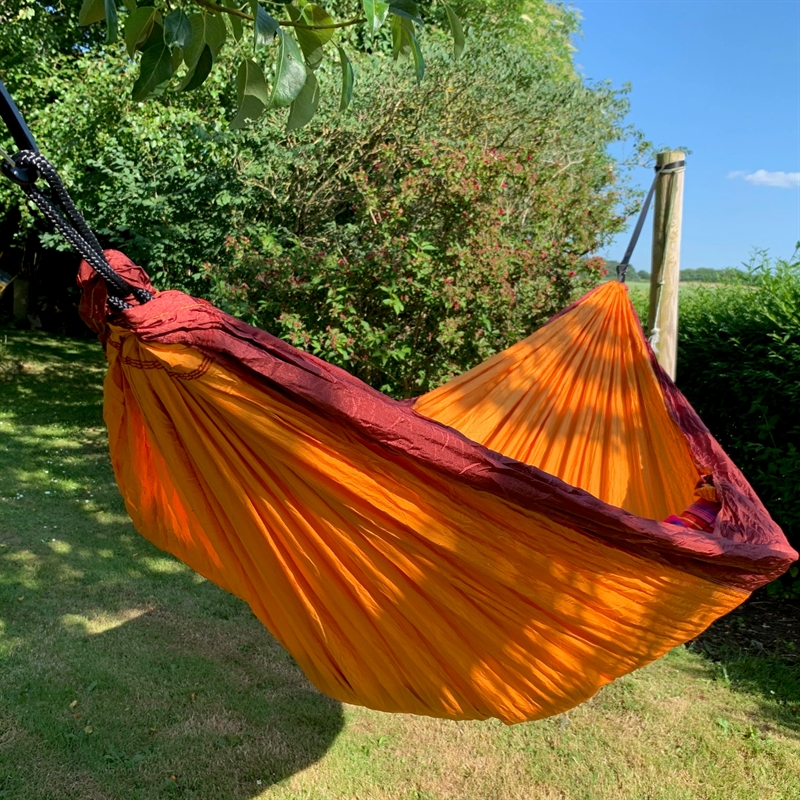 Double hammock 285 x 200 cm. burgundy and orange hammock. The material is 100% nylon (parachute silk). Ultra light parachute silk. Hammock weighs 500 grams.