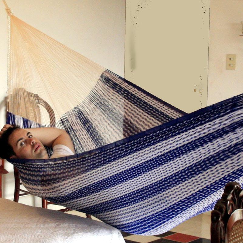 A perfect Mexican net hammock suitable for outdoor use, especially durable for kids playing. Endures the typical Danish rain.