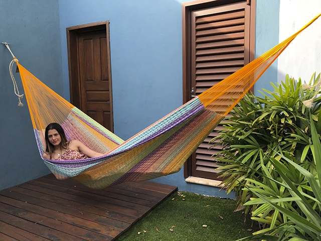 It is ideal for two or more people. It is easy to hang and pack because it is very light. Perfect for interiors. A strong, comfortable and durable hammock.