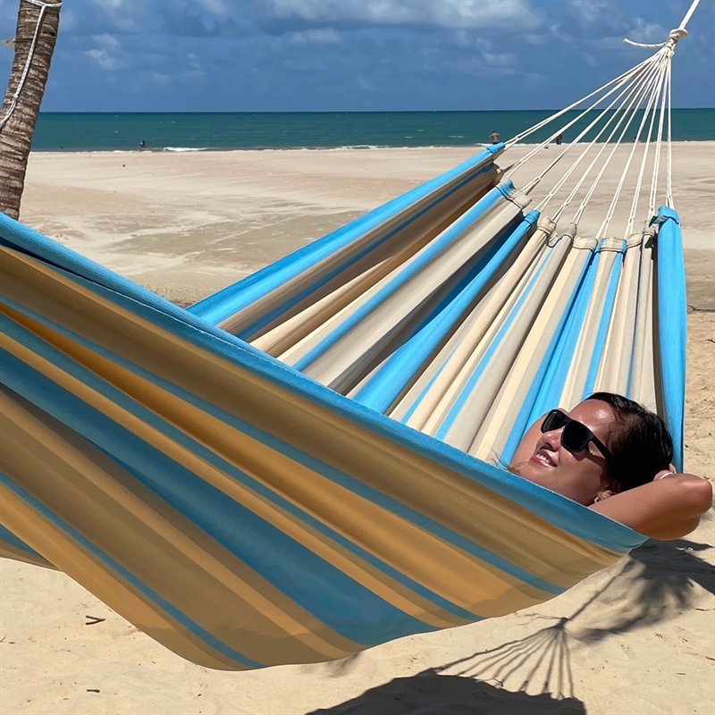The hammock is made from fabrics which are comfortable and leisurely.